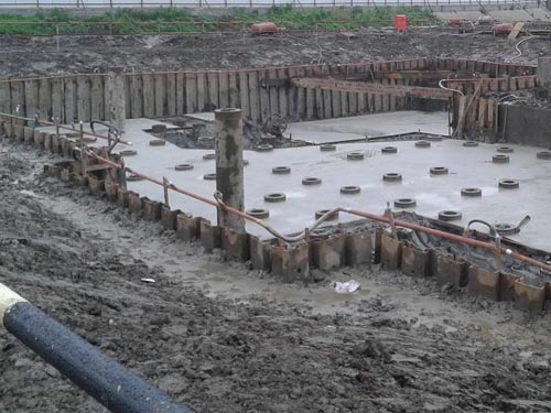 7)在基礎(chǔ)溝槽開挖中,隨時(shí)觀察鋼板樁的變化情況,若有明顯的傾覆或隆卝起狀態(tài),立即在傾覆或隆卝起的部位對(duì)稱支撐。